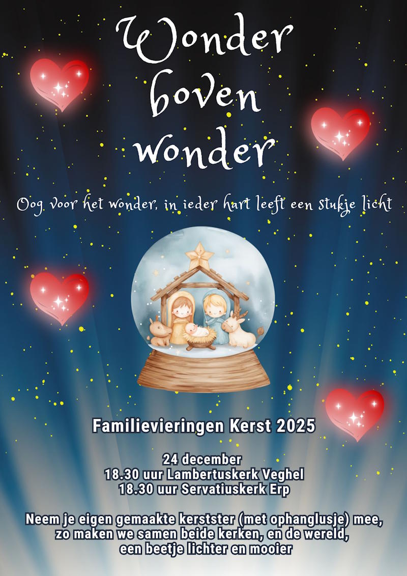 Deze kerst vieren we twee hartverwarmende familiemomenten: op kerstavond in Veghel en in Erp. Onder het thema Wonder boven wonder luisteren we samen in de kerk naar het bijzondere verhaal van Jezus’ geboorte en staan we stil bij het wonder dat ieder van ons zelf mag zijn. Een feestelijke, warme samenkomst vol licht, verbondenheid en verwondering.